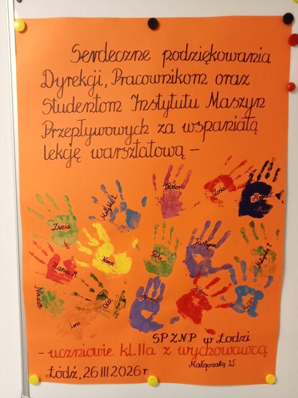 On March 26, our Institute was visited by a group of students from the ZNP Primary School in Łódź. During their stay, the young guests had the opportunity to learn about our work, take a look inside our laboratories, and talk about what the everyday life of scientists looks like. At the end of the visit, we received a beautiful, handmade thank‑you poster.